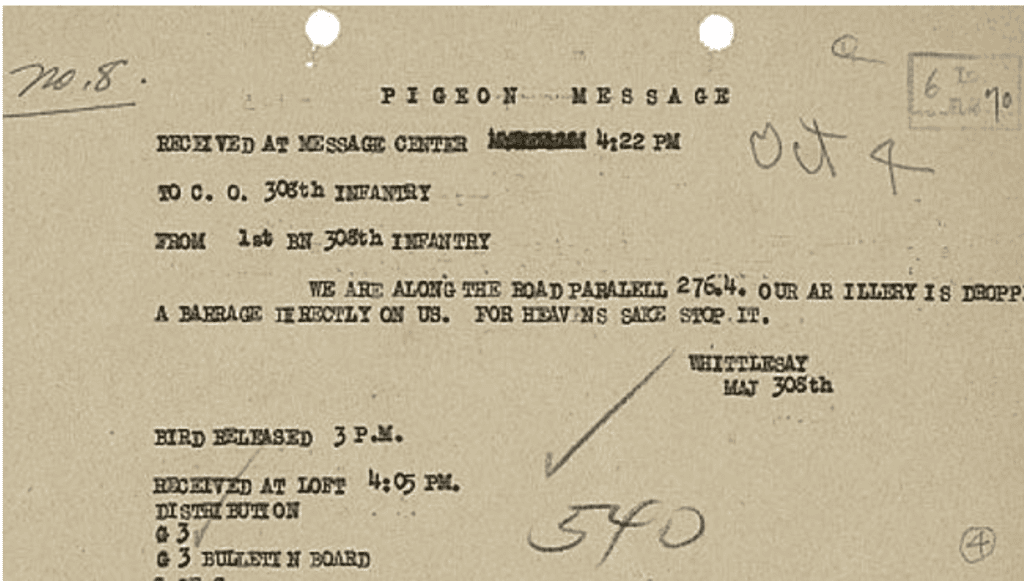 After several failed communication attempts, the battalion turned to homing pigeons. The first bird sent with the message, “Many wounded. We cannot evacuate,” was shot down. A second pigeon carrying, “Men are suffering. Can support be sent?” met the same fate.